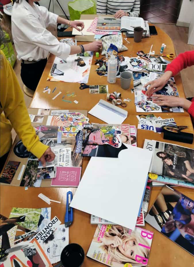 Ci-contre, un atelier tableau de visualisation (ou vision board). Cet atelier, qui est aussi un outil de développement personnel, consiste en un assemblage et collage d'images, photos, dessins, mots, citations inspirantes... cet outil permet de matérialiser ses pensées, rêves, aspirations, projets, passions !